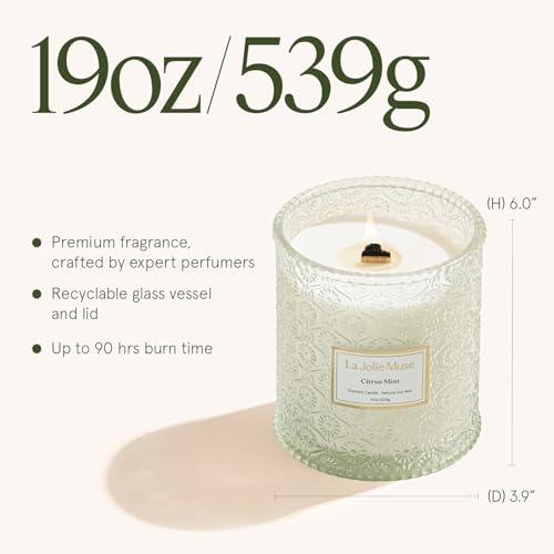 Verfris je huis met de LA JOLIE MUSE geurkaars in Citrus Mint, die 90 uur een luxe aroma verspreidt. Deze duurzame kaars van sojawas met kersenhouten lont biedt een schone en sfeervolle brandervaring.